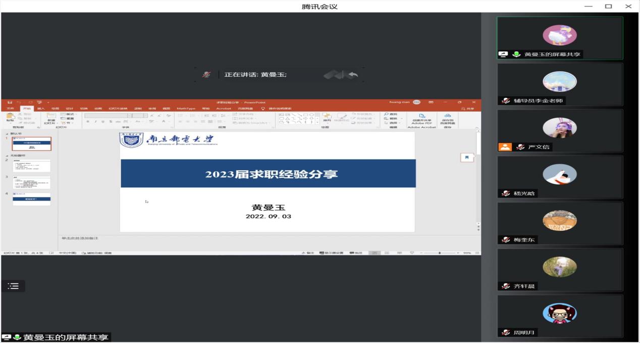 接下来是嘉宾求职就业经验分享,李浩学长从如何选择方向、城市、企业以及未来发展规划等四个方面进行讲解,建议大家将择业目光放的长远。周明月学姐强调一定要在简历上凸显自身与他人的独特性和差异性,这样才能更好地从众多应聘者中脱颖而出。齐轩晨学长为大家解读了当前的就业形势,鼓励大家只要每一步走的扎实,就一定能找到满意的工作。黄曼玉学姐主要对简历制作投递、面试表现以及如何及时复盘面试中自己的问题或优势等几个方面进行讲解。最后,嵇光晗学长强调了制定清晰的求职目标和有效率的进行信息搜集与共享非常重要。