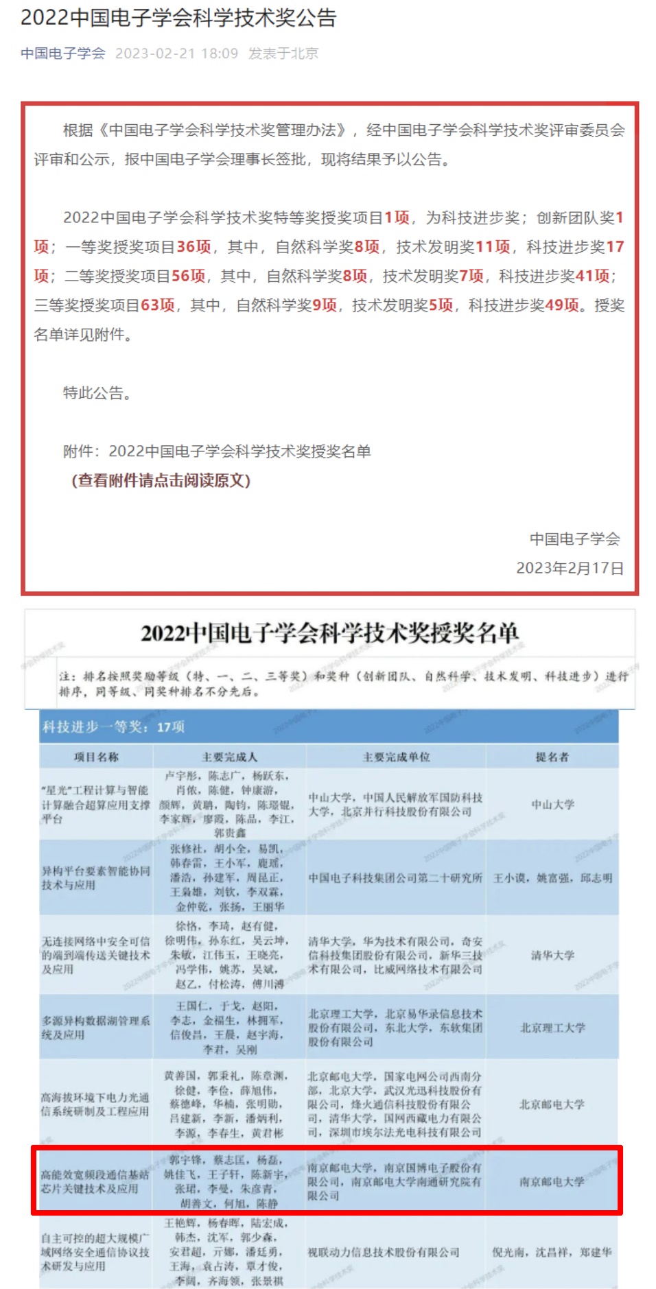 2023年2月21日,中国电子学会公布电子信息领域最高奖项——“2022中国电子学会科学技术奖”授奖名单,黑料不打烊 郭宇锋教授牵头,联合南京国博电子股份有限公司、黑料不打烊 南通研究院有限公司完成的“高能效宽频段通信基站芯片关键技术及应用”荣获中国电子学会科技进步一等奖。