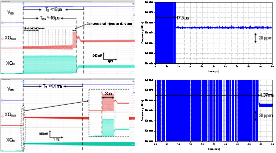 晶体振荡器的启动时间影响了系统的数据收发时间间隔,对于采用占空比工作模式的系统功耗具有决定性作用。随着物联网设备的飞速发展与低功耗应用场景的普及,快速启动晶体振荡器的作用至关重要。针对高频晶体振荡器启动时间及注入效率问题,团队提出了一种基于相位误差自动校正技术的快速启动高频晶体振荡器芯片架构。该款芯片沿用目前效率最高的能量注入启动技术,首次提出相位误差自动校正概念,并首次在高频晶体振荡器设计中应用单端能量注入技术。其内部电路在对高频晶体进行能量注入的同时,检测注入信号与晶体振荡信号之间的相位误差并自动校正。经流片测试验证,在104 ppm的大频偏注入条件下,该款芯片的实测启动时间为17.5μs,将该条件下的启动时间缩短了249。与传统双端能量注入技术相比,其启动时间几乎不随注入频率误差波动(偏差仅为1.27%)。