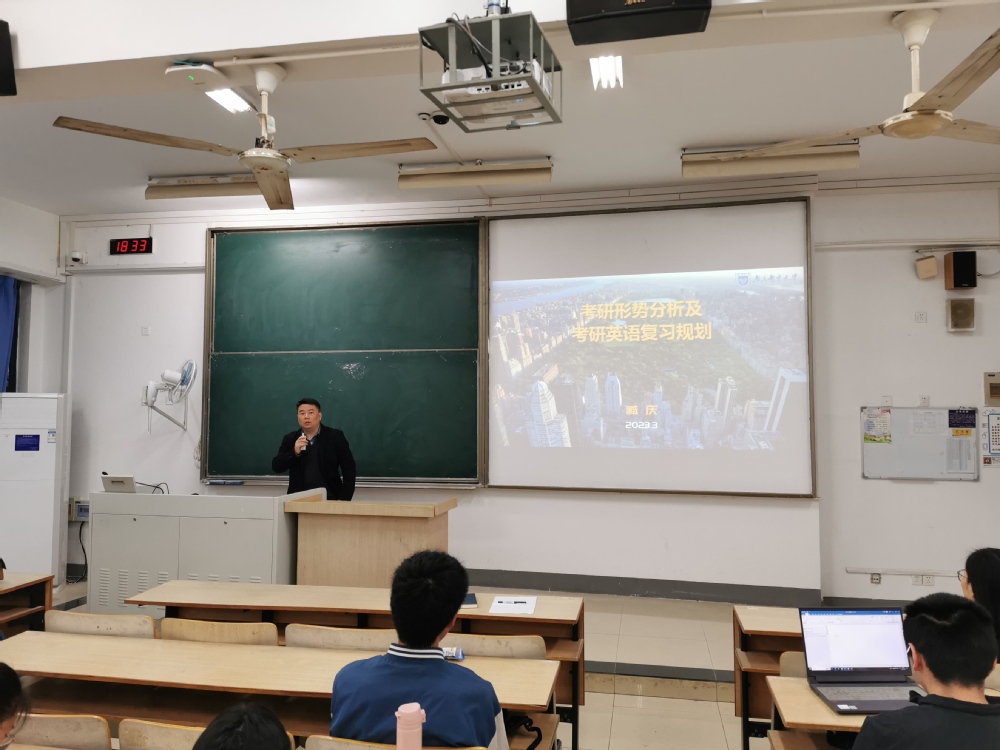 会议伊始,臧庆教授从全国考研形势入手分析了当前学生面临的情况,随后从考研英语课程的复习规划、报名数据、考研英语难度、典型例题等内容为同学们展开了详细介绍。他指出,考研英语的难度级别较高,不同于四六级考试,需要有针对性、有全局观地通盘准备。