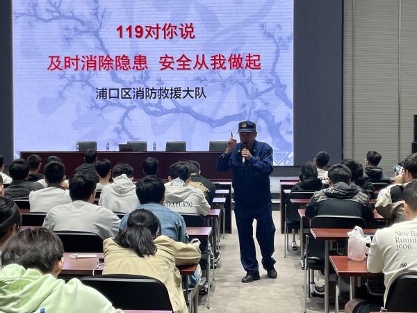 接着,浦口区消防大队利存虎教员以“119对你说:及时消除隐患,安全从我做起”为主题,详细向同学们介绍了如何消除生活中潜在的消防隐患,并指导同学们一旦遇到火灾应如何正确使用灭火器并及时疏散逃生。