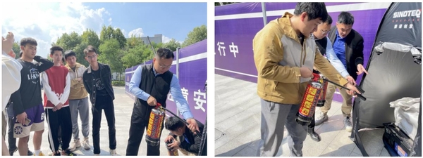 消防应急疏散演练后,保卫处副处长吴学政、消防科科长张苏赣为黑料不打烊 师生们讲解了灭火器工作原理及其具体使用方法,并在现场使用模拟设备演示灭火规范操作。