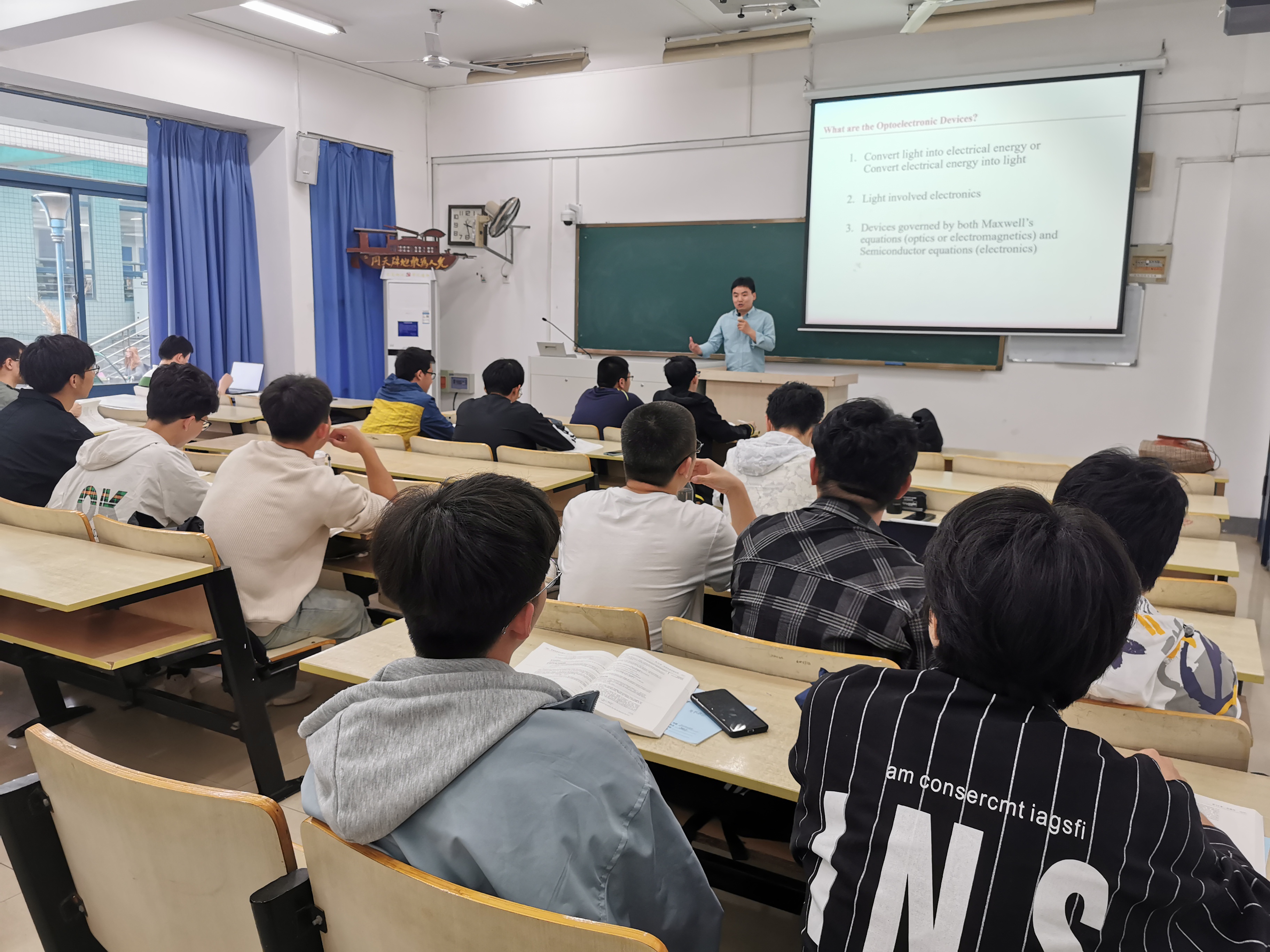 成谢锋教授随机听取新进教师李山的《固态电子器件(全英文)》,并认真地对教师表现、课程内容、学生状态进行记录,课后,成谢锋教授与李山老师进行沟通交流,反馈教学评价,提出改进意见,以便促进教学,提升质量。