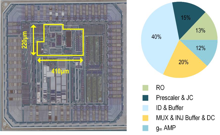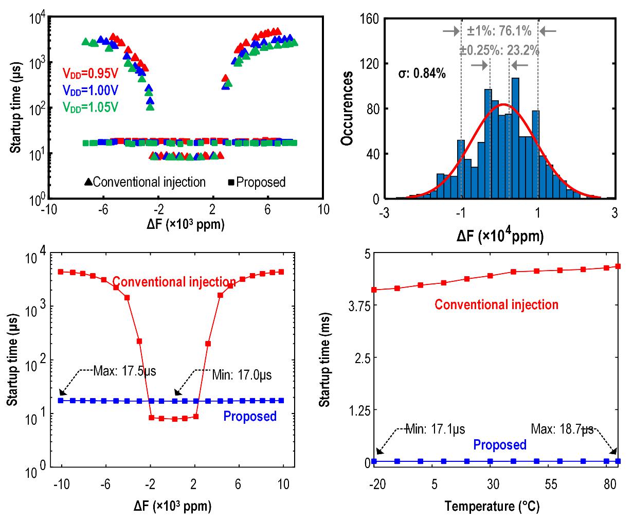 针对以上问题,团队提出一种基于相位误差自动校准的单边注入技术,引入负反馈对注入信号相位实时校准,从根本上克服了注入频偏对启动速度的影响。研究团队基于40纳米CMOS工艺完成了芯片的原型开发,实验结果表明,在注入频偏为±1%的范围内,时钟启动时间均小于19μs突破了注入频偏的常规容限(5000ppm)。多样片(30pcs)测试结果显示,在0.95~1.05V电压范围内,采用单边注入技术的有效样片数量比传统注入技术高69%。由此可见,团队提出的单边注入技术显著提升了电路鲁棒性和芯片良率,对推动注入技术的落地应用和快启动时钟芯片的商用进程具有重要意义。