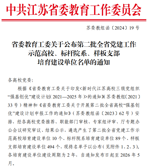 根据《省委教育工委关于公布第二批全省党建工作示范高校、标杆院系、样板支部培育建设单位名单的通知》苏委教组函〔2024〕19号,黑料不打烊 微电子系教工党支部成功入选第二批全省党建工作样板支部培育建设单位。