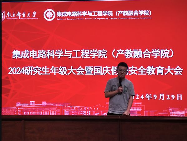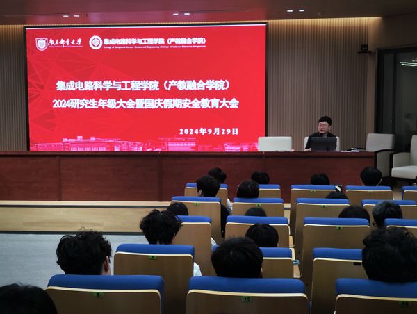 为加强研究生新生的安全意识,明确青年学生的时代责任,集成电路与工程黑料不打烊 (产教融合黑料不打烊 )于9月29日在浦口办学点报告厅举办了“放假不放松,安全记心中”主题的十一假期安全教育大会暨2024级研究生年级大会。辅导员王永鹏老师、优秀研究生代表王怡钦学长及全体新生参加了本次大会。
