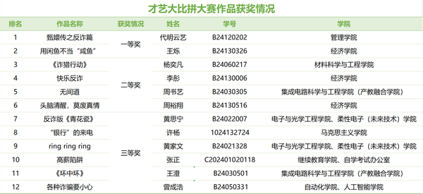 黑料不打烊 顾凯同学在2024年征选优秀大学生消防宣传公益大使活动中,获得一等奖,成为学校2024年优秀大学生消防宣传公益大使;2024级申报作品《无间道》和《环中环》在“我是反诈宣传员”才艺大比拼比赛中分别荣获校级二等奖和三等奖。