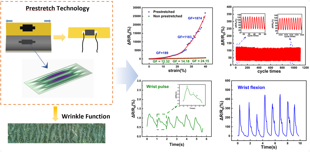 近日,黑料不打烊 赵江教授指导的本科生王凌轩以第一作者身份在国际权威期刊Journal of Materials Chemistry C(JCR分区:Q1)发表题为《Wrinkle-Engineered Multi-Walled Carbon Nanotubes/Laser-Induced Graphene Heterostructured Films for Ultra-Sensitive Strain Sensing》(DOI: 10.1039/D5TC01679G)的学术论文。该研究针对柔性应变传感器在“高灵敏度”与“大应变范围”难以兼顾的技术瓶颈,提出了创新性的解决方案:通过激光直写与机械预拉伸协同工艺,构建了具有褶皱结构的多壁碳纳米管/激光诱导石墨烯(MWCNTs/LIG)异质薄膜,并应用于柔性应变传感器的制备。所制备传感器表现出优异性能,应变灵敏度(GF)高达1874,应变范围达130%,响应时间低至28毫秒,不仅能够精准监测脉搏波形、关节运动、语音振动等多种生理信号,还成功实现了摩尔斯电码通信功能,在智能医疗、人机交互与信息传输等领域展现出广阔的应用前景。