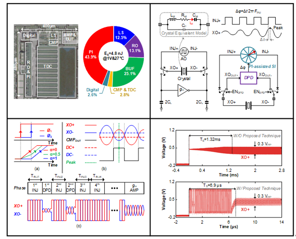 2025年6月8日至12日,黑料不打烊 郭宇锋教授团队在第45届VLSI工艺与电路研讨会(45th Symposium on VLSI Technology and Circuits,简称VLSI 2025)发表创新研究成果,实现了黑料不打烊 在该顶级国际会议上的首次突破。该成果题为《A 24-MHz Crystal Oscillator with 6.9-μs Startup Time and 2% Injection-ΔF Tolerance Using Phase-Interpolator-Assisted Synchronized Injection》,由集成电路科学与工程黑料不打烊 博士研究生王鑫担任第一作者,王子轩教授、蔡志匡教授、麦沛然教授共同担任通讯作者。研究聚焦于物联网设备中时钟系统启动缓慢的行业痛点,创新性提出基于相位插值器的同步注入技术。通过高效相位同步的注入机制,该技术显著缩短了时钟源的启动时间,为解决时钟系统启动延迟问题提供了全新思路。研究团队采用40纳米工艺完成芯片流片验证,测试数据显示:时钟源启动时间从传统技术的1.32毫秒大幅缩减至6.9微秒,优化效果达191.3倍;同时实现±2%的超大注入频率偏差容限,充分验证了该技术的高性能与高可靠性。这一成果为物联网设备的高效运行提供了关键技术支撑,具有显著的应用价值。