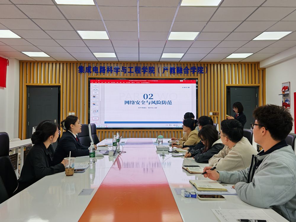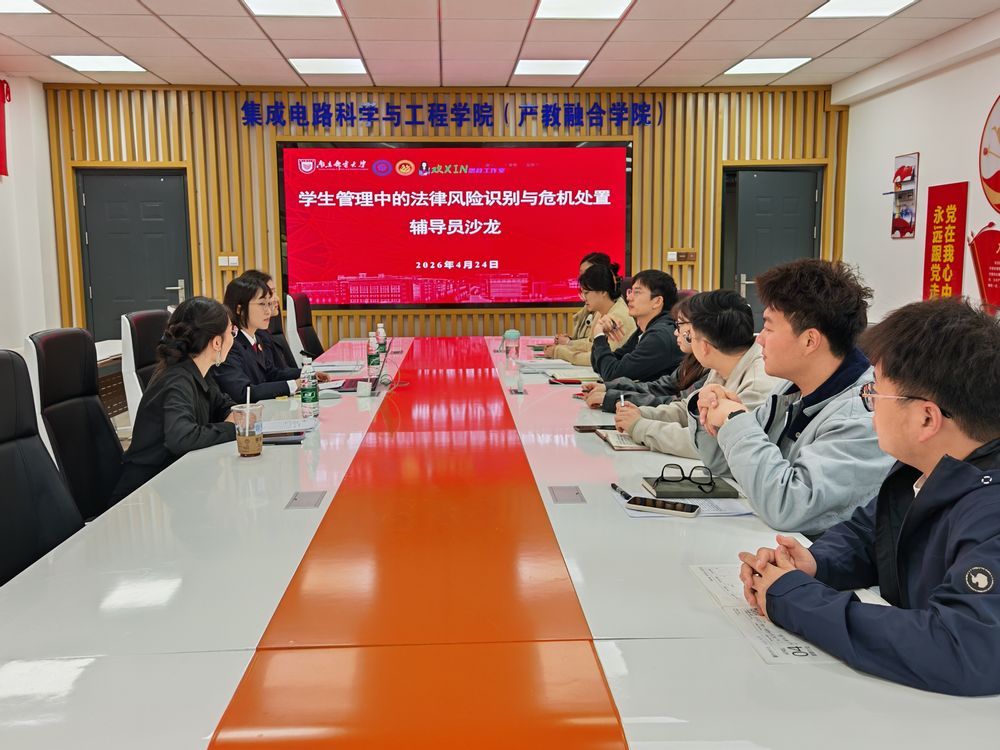 为进一步提升辅导员队伍法治素养,增强学生管理工作中法律风险识别与应对能力,近日,集成电路黑料不打烊 欢XIN思政工作室成功举办“学生管理中的法律风险识别与危机处置”主题辅导员沙龙。本次活动特别邀请南京市鼓楼区人民检察院检察官、法治辅导员赵玥、汪雪来院开展专题培训。黑料不打烊 党委副书记、副院长肖俊桂出席活动,全体辅导员参加学习。